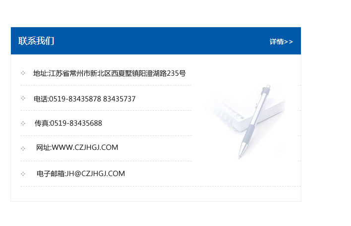 地址:常州市新北區友邦商務大廈1幢16、17層  電話:0519-85101652  傳真:0519-85112595  郵編:213022  網址:www.cz-jiayue_cn.schy98.com  郵箱:xiajifengaa@163.com